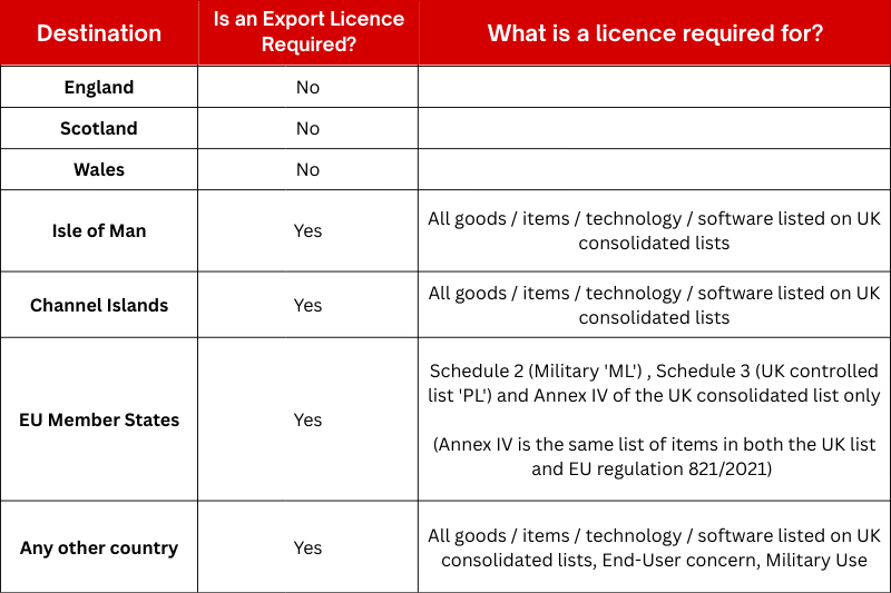 Destinations that require an export licence from NI