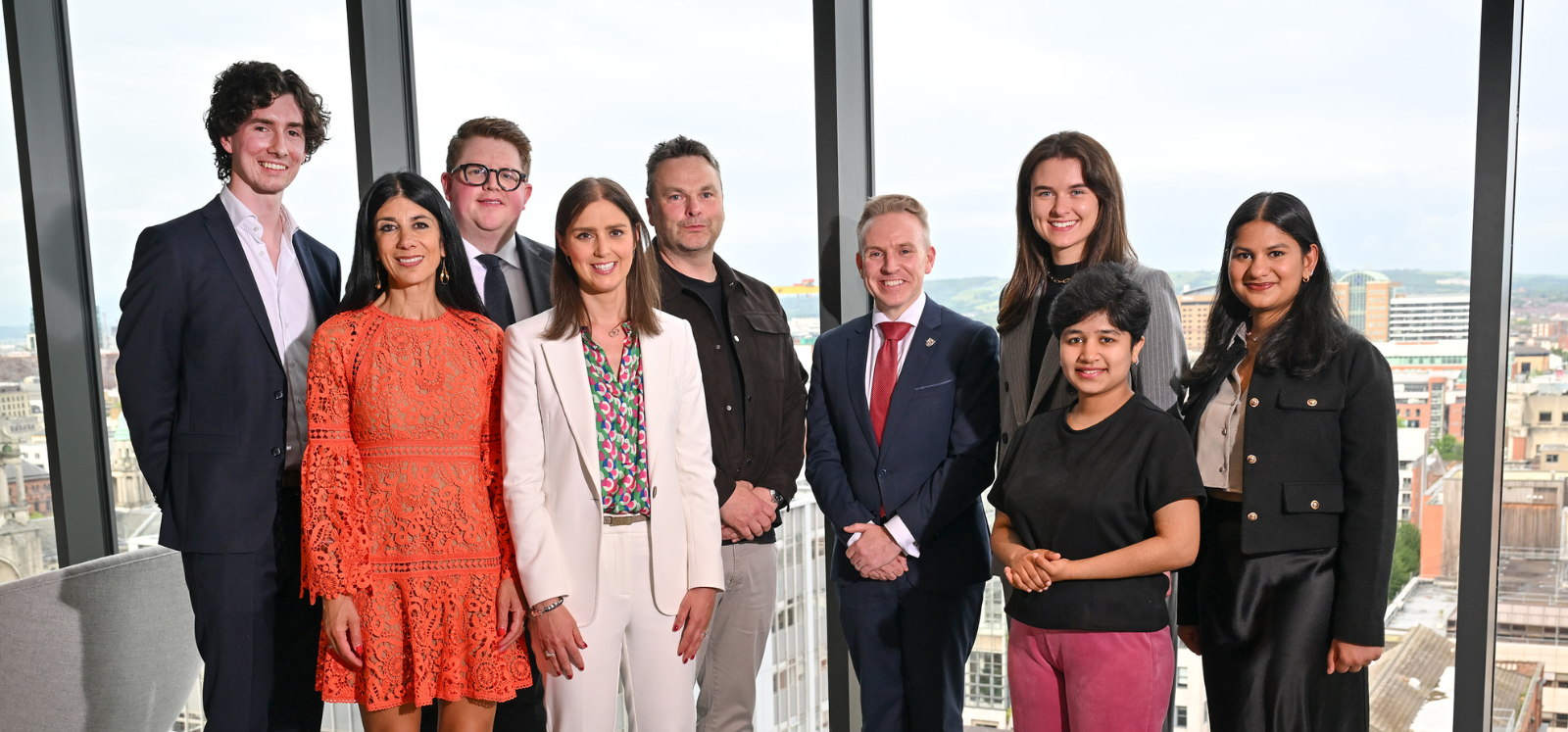 Dr Ryan Feeney Vice President of Governance and External Affairs and Registrar at Queen's, Foundation Board Member Gina Copty (second from left) and Bafta winning Queen's graduate Declan Lawn with some of the Belfast cohort of Queen's Leaders 18-45: Peter Gilleece, Ryan Crown, Jenny Moore, Naomi McGregor, Varshitha Manjunath and Ruchira Rangaprasad. Missing from the photo is Erin McGrattan.