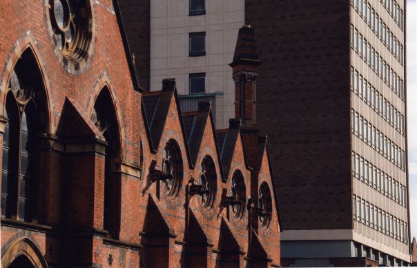Large windows provide light to the ‘now’ social space and silent study area of the building. The central rose windows show the letters ‘QCB’ which stands for Queen’s College, Belfast.
