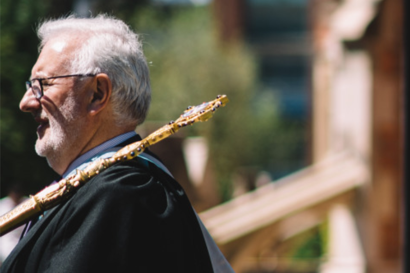 The bearer of the mace in academic processions guards the Chancellor in the tradition in which medieval sergeants-at-arms marched as royal bodyguards. The Esquire Bedell bears the mace in the Queen’s University Belfast academic procession. They lead the Chancellor or Vice-Chancellor into the ceremony and put the mace on stand on the stage, which is the cue for members of the academic procession to remove their head dress. The Esquire Bedell also looks after the honorary graduates, leading them out at the end of the ceremony. The mace is always present during the conferment of degrees.