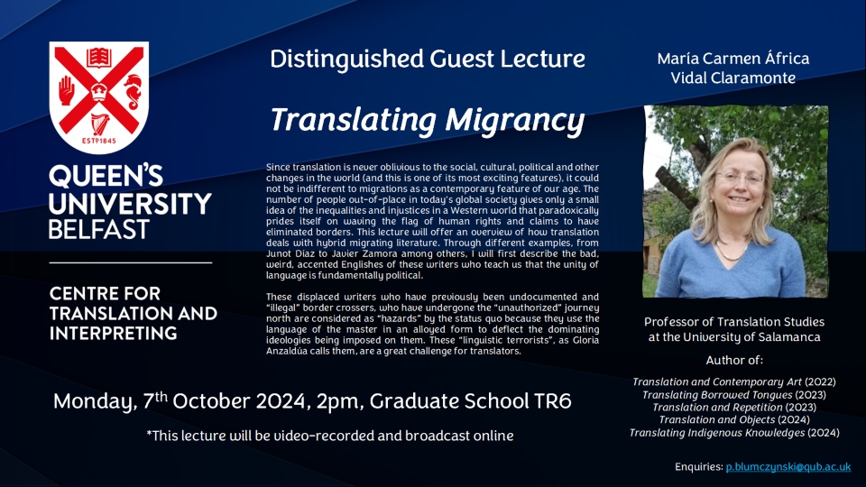 Centre for Translation and Interpreting is delighted to host María Carmen África Vidal Claramonte, Professor of Translation Studies at the University of Salamanca who will be presenting on 'Translating Migrancy'