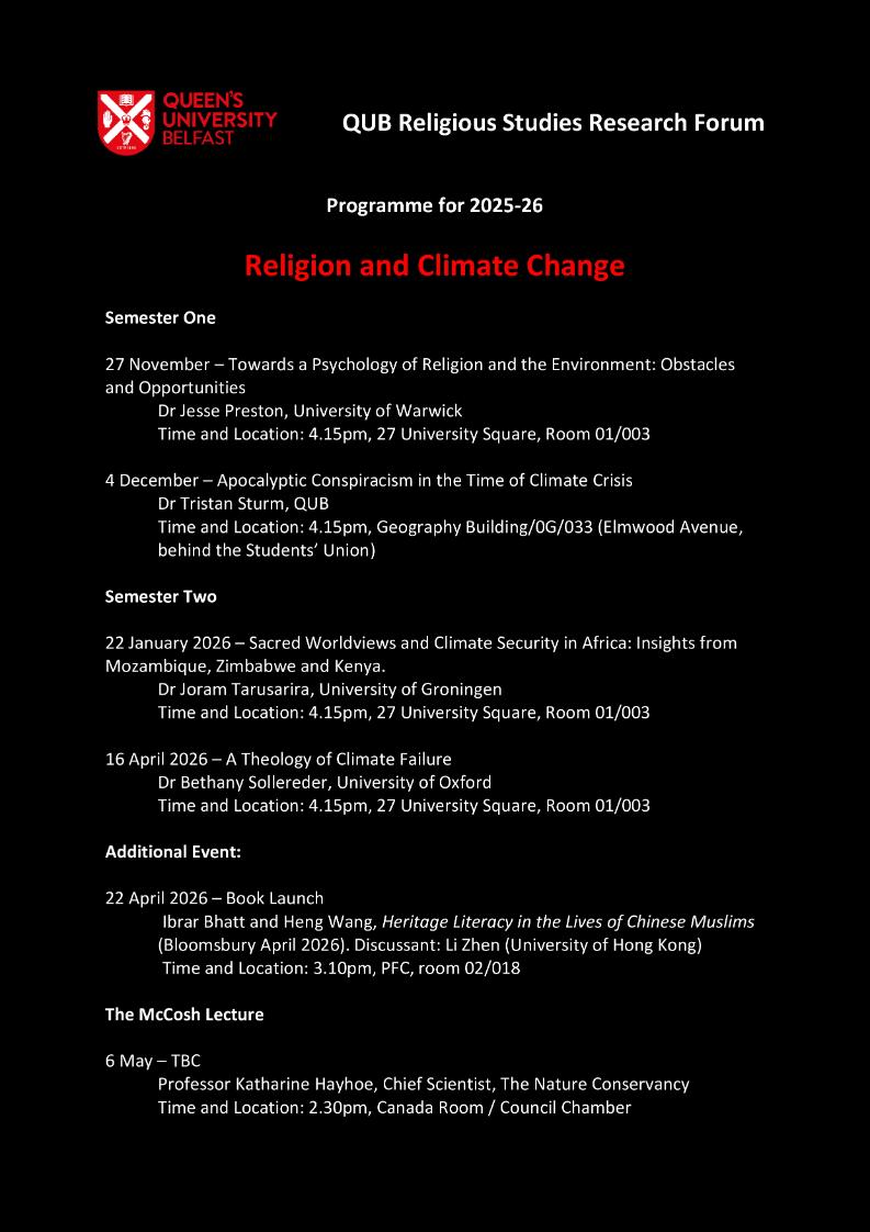 The Queen's University Belfast Religious Studies Research Forum is an interdisciplinary grouping of scholars from across the University interested in exploring themes and issues relating to religion in culture and society. The Forum sponsors the annual McCosh lecture, delivered in recent years by Onora O'Neill (2019), David Hempton (2020), Sarah Coakley (2021), Colin Kidd (2022), David Livingstone (2023), Mary Daly (2024) and Irene Tracey (2025). It also organises an annual series of research seminars in the University but open to the public.